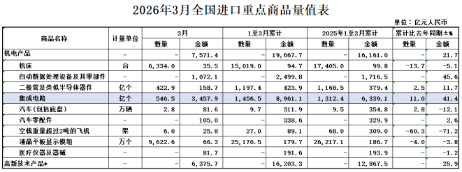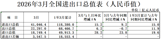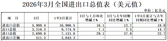 按美元计价,2026年前3个月,我国进出口总值1.69万亿美元,增长18.0%。其中,出口9774.9亿美元,增长14.7%;进口7131.6亿美元,增长22.7%。3月份我国进出口总值5909.4亿美元,增长12.7%。其中,出口3210.3亿美元,增长2.5%;进口2699.0亿美元,增长27.8%。(海关总署)